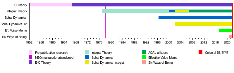 It's been nearly 70 years since Graves started his research. 55 since his first major publication, over 40 since he abandoned the manuscript of NEQ due to ill health. It's been 25 years since Spiral Dynamics was published, nearly 20 since SDi was created, and 15 since "altitudes" of slightly different colors subsumed SDi within Integral Theory. Four years ago, Hanzi published a theory with explicit parallels to Graves in the "cultural code" and "effective value meme" components. Slightly more than a year ago I started soliciting feedback on what I'm now calling the Six Ways of Being. And just under a month ago, Nora Bateson charged that stage theory, as a whole, is BS, and "colonial as hell."